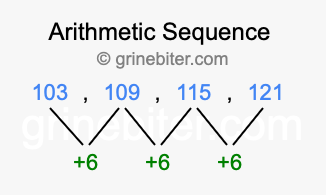So, what type of sequence is 103, 109, 115, 121? The sequence 103, 109, 115, 121 has a common difference of +6 between each term. We call this kind of sequence an arithmetic sequence. Below is an image illustrating the correlation between the arithmetic sequence 103, 109, 115, 121 and its common difference of +6.