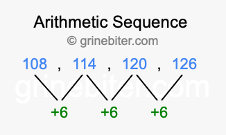 So, what type of sequence is 108, 114, 120, 126? The sequence 108, 114, 120, 126 has a common difference of +6 between each term. We call this kind of sequence an arithmetic sequence. Below is an image illustrating the correlation between the arithmetic sequence 108, 114, 120, 126 and its common difference of +6.