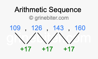 So, what type of sequence is 109, 126, 143, 160? The sequence 109, 126, 143, 160 has a common difference of +17 between each term. We call this kind of sequence an arithmetic sequence. Below is an image illustrating the correlation between the arithmetic sequence 109, 126, 143, 160 and its common difference of +17.