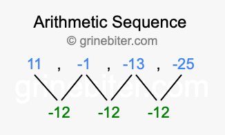 So, what type of sequence is 11, -1, -13, -25? The sequence 11, -1, -13, -25 has a common difference of -12 between each term. We call this kind of sequence an arithmetic sequence. Below is an image illustrating the correlation between the arithmetic sequence 11, -1, -13, -25 and its common difference of -12.