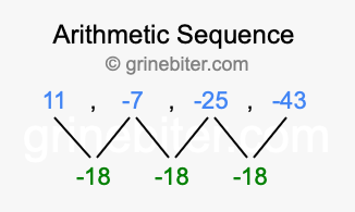 So, what type of sequence is 11, -7, -25, -43? The sequence 11, -7, -25, -43 has a common difference of -18 between each term. We call this kind of sequence an arithmetic sequence. Below is an image illustrating the correlation between the arithmetic sequence 11, -7, -25, -43 and its common difference of -18.