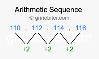 So, what type of sequence is 110, 112, 114, 116? The sequence 110, 112, 114, 116 has a common difference of +2 between each term. We call this kind of sequence an arithmetic sequence. Below is an image illustrating the correlation between the arithmetic sequence 110, 112, 114, 116 and its common difference of +2.