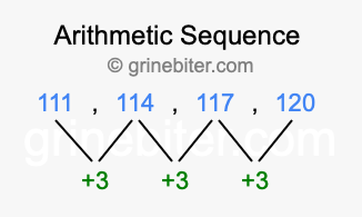 So, what type of sequence is 111, 114, 117, 120? The sequence 111, 114, 117, 120 has a common difference of +3 between each term. We call this kind of sequence an arithmetic sequence. Below is an image illustrating the correlation between the arithmetic sequence 111, 114, 117, 120 and its common difference of +3.