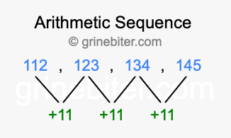So, what type of sequence is 112, 123, 134, 145? The sequence 112, 123, 134, 145 has a common difference of +11 between each term. We call this kind of sequence an arithmetic sequence. Below is an image illustrating the correlation between the arithmetic sequence 112, 123, 134, 145 and its common difference of +11.