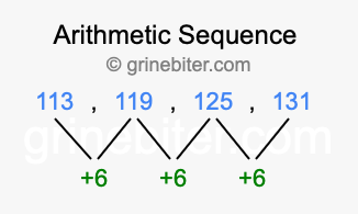 So, what type of sequence is 113, 119, 125, 131? The sequence 113, 119, 125, 131 has a common difference of +6 between each term. We call this kind of sequence an arithmetic sequence. Below is an image illustrating the correlation between the arithmetic sequence 113, 119, 125, 131 and its common difference of +6.