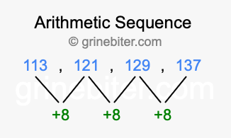 So, what type of sequence is 113, 121, 129, 137? The sequence 113, 121, 129, 137 has a common difference of +8 between each term. We call this kind of sequence an arithmetic sequence. Below is an image illustrating the correlation between the arithmetic sequence 113, 121, 129, 137 and its common difference of +8.