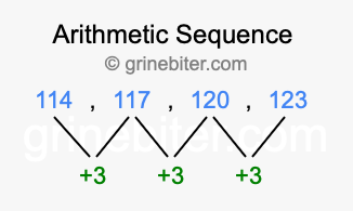 So, what type of sequence is 114, 117, 120, 123? The sequence 114, 117, 120, 123 has a common difference of +3 between each term. We call this kind of sequence an arithmetic sequence. Below is an image illustrating the correlation between the arithmetic sequence 114, 117, 120, 123 and its common difference of +3.