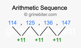 So, what type of sequence is 114, 125, 136, 147? The sequence 114, 125, 136, 147 has a common difference of +11 between each term. We call this kind of sequence an arithmetic sequence. Below is an image illustrating the correlation between the arithmetic sequence 114, 125, 136, 147 and its common difference of +11.