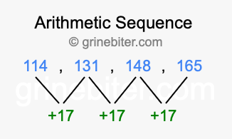 So, what type of sequence is 114, 131, 148, 165? The sequence 114, 131, 148, 165 has a common difference of +17 between each term. We call this kind of sequence an arithmetic sequence. Below is an image illustrating the correlation between the arithmetic sequence 114, 131, 148, 165 and its common difference of +17.
