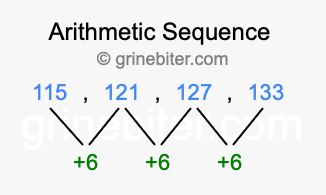 So, what type of sequence is 115, 121, 127, 133? The sequence 115, 121, 127, 133 has a common difference of +6 between each term. We call this kind of sequence an arithmetic sequence. Below is an image illustrating the correlation between the arithmetic sequence 115, 121, 127, 133 and its common difference of +6.