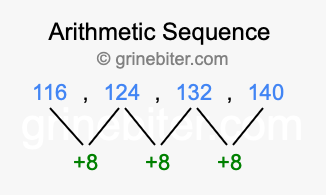 So, what type of sequence is 116, 124, 132, 140? The sequence 116, 124, 132, 140 has a common difference of +8 between each term. We call this kind of sequence an arithmetic sequence. Below is an image illustrating the correlation between the arithmetic sequence 116, 124, 132, 140 and its common difference of +8.