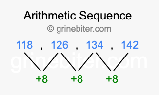 So, what type of sequence is 118, 126, 134, 142? The sequence 118, 126, 134, 142 has a common difference of +8 between each term. We call this kind of sequence an arithmetic sequence. Below is an image illustrating the correlation between the arithmetic sequence 118, 126, 134, 142 and its common difference of +8.