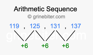 So, what type of sequence is 119, 125, 131, 137? The sequence 119, 125, 131, 137 has a common difference of +6 between each term. We call this kind of sequence an arithmetic sequence. Below is an image illustrating the correlation between the arithmetic sequence 119, 125, 131, 137 and its common difference of +6.