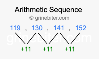 So, what type of sequence is 119, 130, 141, 152? The sequence 119, 130, 141, 152 has a common difference of +11 between each term. We call this kind of sequence an arithmetic sequence. Below is an image illustrating the correlation between the arithmetic sequence 119, 130, 141, 152 and its common difference of +11.