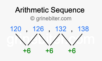 So, what type of sequence is 120, 126, 132, 138? The sequence 120, 126, 132, 138 has a common difference of +6 between each term. We call this kind of sequence an arithmetic sequence. Below is an image illustrating the correlation between the arithmetic sequence 120, 126, 132, 138 and its common difference of +6.