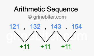 So, what type of sequence is 121, 132, 143, 154? The sequence 121, 132, 143, 154 has a common difference of +11 between each term. We call this kind of sequence an arithmetic sequence. Below is an image illustrating the correlation between the arithmetic sequence 121, 132, 143, 154 and its common difference of +11.