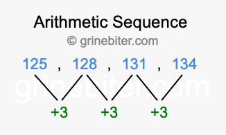So, what type of sequence is 125, 128, 131, 134? The sequence 125, 128, 131, 134 has a common difference of +3 between each term. We call this kind of sequence an arithmetic sequence. Below is an image illustrating the correlation between the arithmetic sequence 125, 128, 131, 134 and its common difference of +3.