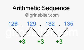 So, what type of sequence is 126, 129, 132, 135? The sequence 126, 129, 132, 135 has a common difference of +3 between each term. We call this kind of sequence an arithmetic sequence. Below is an image illustrating the correlation between the arithmetic sequence 126, 129, 132, 135 and its common difference of +3.