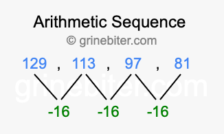So, what type of sequence is 129, 113, 97, 81? The sequence 129, 113, 97, 81 has a common difference of -16 between each term. We call this kind of sequence an arithmetic sequence. Below is an image illustrating the correlation between the arithmetic sequence 129, 113, 97, 81 and its common difference of -16.
