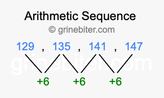 So, what type of sequence is 129, 135, 141, 147? The sequence 129, 135, 141, 147 has a common difference of +6 between each term. We call this kind of sequence an arithmetic sequence. Below is an image illustrating the correlation between the arithmetic sequence 129, 135, 141, 147 and its common difference of +6.