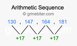 So, what type of sequence is 130, 147, 164, 181? The sequence 130, 147, 164, 181 has a common difference of +17 between each term. We call this kind of sequence an arithmetic sequence. Below is an image illustrating the correlation between the arithmetic sequence 130, 147, 164, 181 and its common difference of +17.