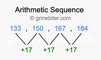 So, what type of sequence is 133, 150, 167, 184? The sequence 133, 150, 167, 184 has a common difference of +17 between each term. We call this kind of sequence an arithmetic sequence. Below is an image illustrating the correlation between the arithmetic sequence 133, 150, 167, 184 and its common difference of +17.