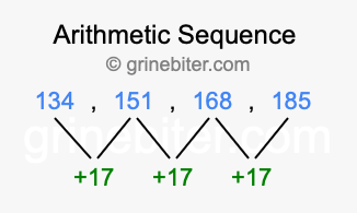 So, what type of sequence is 134, 151, 168, 185? The sequence 134, 151, 168, 185 has a common difference of +17 between each term. We call this kind of sequence an arithmetic sequence. Below is an image illustrating the correlation between the arithmetic sequence 134, 151, 168, 185 and its common difference of +17.