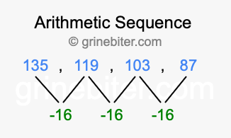 So, what type of sequence is 135, 119, 103, 87? The sequence 135, 119, 103, 87 has a common difference of -16 between each term. We call this kind of sequence an arithmetic sequence. Below is an image illustrating the correlation between the arithmetic sequence 135, 119, 103, 87 and its common difference of -16.