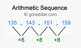 So, what type of sequence is 135, 143, 151, 159? The sequence 135, 143, 151, 159 has a common difference of +8 between each term. We call this kind of sequence an arithmetic sequence. Below is an image illustrating the correlation between the arithmetic sequence 135, 143, 151, 159 and its common difference of +8.