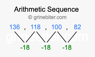 So, what type of sequence is 136, 118, 100, 82? The sequence 136, 118, 100, 82 has a common difference of -18 between each term. We call this kind of sequence an arithmetic sequence. Below is an image illustrating the correlation between the arithmetic sequence 136, 118, 100, 82 and its common difference of -18.