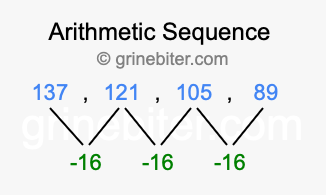 So, what type of sequence is 137, 121, 105, 89? The sequence 137, 121, 105, 89 has a common difference of -16 between each term. We call this kind of sequence an arithmetic sequence. Below is an image illustrating the correlation between the arithmetic sequence 137, 121, 105, 89 and its common difference of -16.
