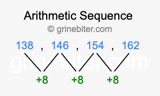 So, what type of sequence is 138, 146, 154, 162? The sequence 138, 146, 154, 162 has a common difference of +8 between each term. We call this kind of sequence an arithmetic sequence. Below is an image illustrating the correlation between the arithmetic sequence 138, 146, 154, 162 and its common difference of +8.