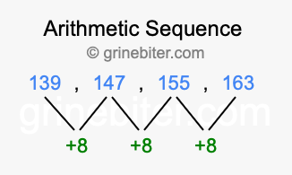 So, what type of sequence is 139, 147, 155, 163? The sequence 139, 147, 155, 163 has a common difference of +8 between each term. We call this kind of sequence an arithmetic sequence. Below is an image illustrating the correlation between the arithmetic sequence 139, 147, 155, 163 and its common difference of +8.