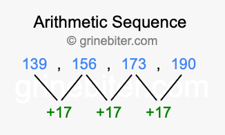 So, what type of sequence is 139, 156, 173, 190? The sequence 139, 156, 173, 190 has a common difference of +17 between each term. We call this kind of sequence an arithmetic sequence. Below is an image illustrating the correlation between the arithmetic sequence 139, 156, 173, 190 and its common difference of +17.
