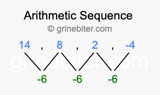 So, what type of sequence is 14, 8, 2, -4? The sequence 14, 8, 2, -4 has a common difference of -6 between each term. We call this kind of sequence an arithmetic sequence. Below is an image illustrating the correlation between the arithmetic sequence 14, 8, 2, -4 and its common difference of -6.