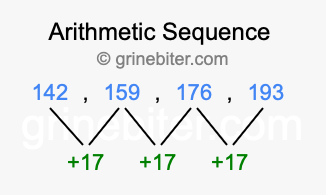 So, what type of sequence is 142, 159, 176, 193? The sequence 142, 159, 176, 193 has a common difference of +17 between each term. We call this kind of sequence an arithmetic sequence. Below is an image illustrating the correlation between the arithmetic sequence 142, 159, 176, 193 and its common difference of +17.