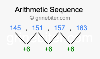 So, what type of sequence is 145, 151, 157, 163? The sequence 145, 151, 157, 163 has a common difference of +6 between each term. We call this kind of sequence an arithmetic sequence. Below is an image illustrating the correlation between the arithmetic sequence 145, 151, 157, 163 and its common difference of +6.