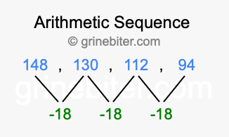 So, what type of sequence is 148, 130, 112, 94? The sequence 148, 130, 112, 94 has a common difference of -18 between each term. We call this kind of sequence an arithmetic sequence. Below is an image illustrating the correlation between the arithmetic sequence 148, 130, 112, 94 and its common difference of -18.