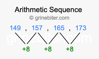 So, what type of sequence is 149, 157, 165, 173? The sequence 149, 157, 165, 173 has a common difference of +8 between each term. We call this kind of sequence an arithmetic sequence. Below is an image illustrating the correlation between the arithmetic sequence 149, 157, 165, 173 and its common difference of +8.