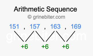So, what type of sequence is 151, 157, 163, 169? The sequence 151, 157, 163, 169 has a common difference of +6 between each term. We call this kind of sequence an arithmetic sequence. Below is an image illustrating the correlation between the arithmetic sequence 151, 157, 163, 169 and its common difference of +6.