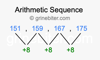 So, what type of sequence is 151, 159, 167, 175? The sequence 151, 159, 167, 175 has a common difference of +8 between each term. We call this kind of sequence an arithmetic sequence. Below is an image illustrating the correlation between the arithmetic sequence 151, 159, 167, 175 and its common difference of +8.