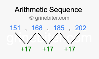 So, what type of sequence is 151, 168, 185, 202? The sequence 151, 168, 185, 202 has a common difference of +17 between each term. We call this kind of sequence an arithmetic sequence. Below is an image illustrating the correlation between the arithmetic sequence 151, 168, 185, 202 and its common difference of +17.