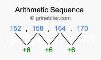 So, what type of sequence is 152, 158, 164, 170? The sequence 152, 158, 164, 170 has a common difference of +6 between each term. We call this kind of sequence an arithmetic sequence. Below is an image illustrating the correlation between the arithmetic sequence 152, 158, 164, 170 and its common difference of +6.