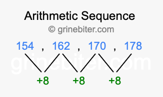 So, what type of sequence is 154, 162, 170, 178? The sequence 154, 162, 170, 178 has a common difference of +8 between each term. We call this kind of sequence an arithmetic sequence. Below is an image illustrating the correlation between the arithmetic sequence 154, 162, 170, 178 and its common difference of +8.