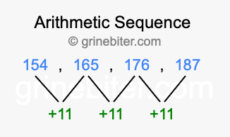 So, what type of sequence is 154, 165, 176, 187? The sequence 154, 165, 176, 187 has a common difference of +11 between each term. We call this kind of sequence an arithmetic sequence. Below is an image illustrating the correlation between the arithmetic sequence 154, 165, 176, 187 and its common difference of +11.
