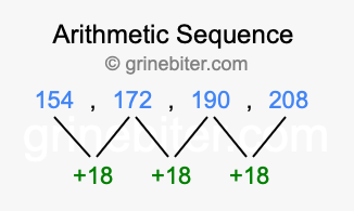 So, what type of sequence is 154, 172, 190, 208? The sequence 154, 172, 190, 208 has a common difference of +18 between each term. We call this kind of sequence an arithmetic sequence. Below is an image illustrating the correlation between the arithmetic sequence 154, 172, 190, 208 and its common difference of +18.