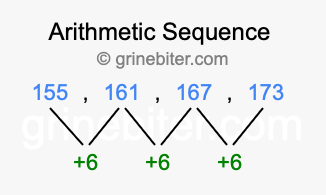 So, what type of sequence is 155, 161, 167, 173? The sequence 155, 161, 167, 173 has a common difference of +6 between each term. We call this kind of sequence an arithmetic sequence. Below is an image illustrating the correlation between the arithmetic sequence 155, 161, 167, 173 and its common difference of +6.