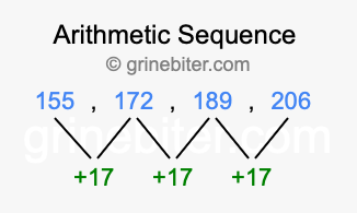 So, what type of sequence is 155, 172, 189, 206? The sequence 155, 172, 189, 206 has a common difference of +17 between each term. We call this kind of sequence an arithmetic sequence. Below is an image illustrating the correlation between the arithmetic sequence 155, 172, 189, 206 and its common difference of +17.