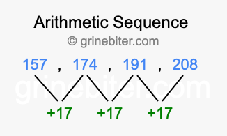 So, what type of sequence is 157, 174, 191, 208? The sequence 157, 174, 191, 208 has a common difference of +17 between each term. We call this kind of sequence an arithmetic sequence. Below is an image illustrating the correlation between the arithmetic sequence 157, 174, 191, 208 and its common difference of +17.