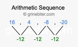 So, what type of sequence is 16, 4, -8, -20? The sequence 16, 4, -8, -20 has a common difference of -12 between each term. We call this kind of sequence an arithmetic sequence. Below is an image illustrating the correlation between the arithmetic sequence 16, 4, -8, -20 and its common difference of -12.